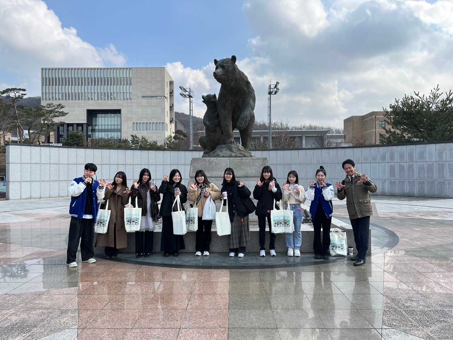 最後に、大学内を案内してくださった学生の二人と壇国大学の象徴である大きなクマの銅像の前で写真を撮りました。
