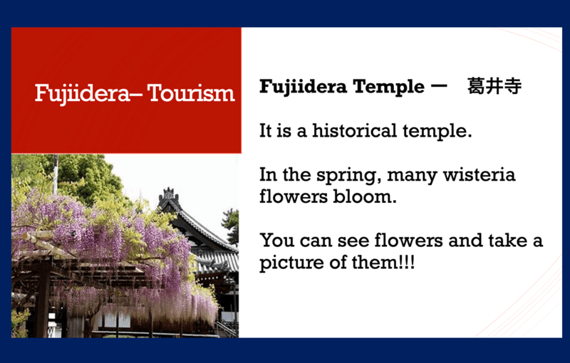 学生たちは「持続可能な観光」をテーマに取り組みました。みなさん、高校でSDGs(持続可能な開発目標)を勉強したかもしれませんね。持続可能な観光、を考える場合は、SDGsを観光にどの適用できるかを検討します。例えば、観光が原因で増えるゴミや交通に、自治体や市民はどう対処すればいいでしょうか?摂南大学と台湾の大学生は、自分たちの住む地域で観光が引き起こす問題を調べ、解決策を英語で議論しました。