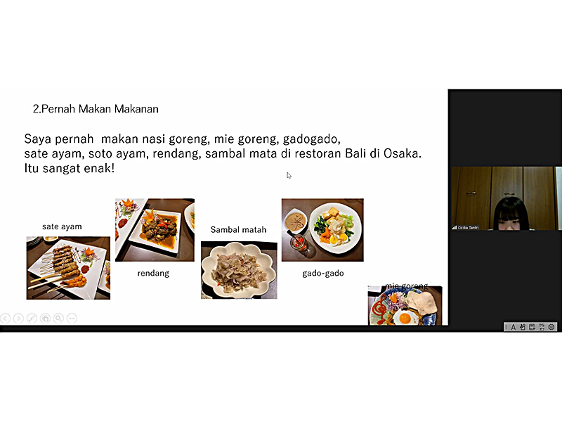 授業は土曜・日曜を除く毎日、日本時間の朝10時から午後2時30分まで行われ、最終日にはこれまでの成果を踏まえ、プレゼンテーションを通じて、インドネシアの地域紹介や食べ物の披露を行いました。最終回の授業には授業担当の先生方のみならず、ストモ博士大学の在学生も参加し、大いに盛り上がりました。今回のプログラムに参加した学生の感想を、以下にご紹介します。