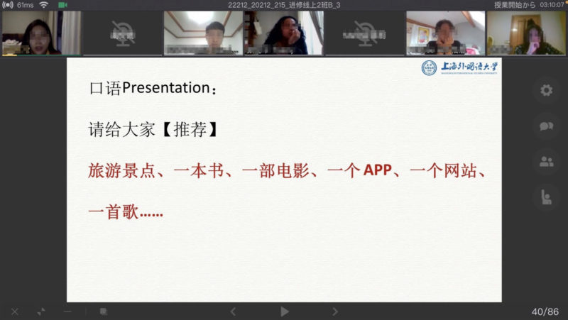 授業は、ClassIn(クラスイン)というオンライン授業システムを使い、Microsoft Teamsのようにリアルタイム授業やVOD、教材配布、課題提出、ルームに分かれたグループ作業などすべてこのアプリ上で行いました。授業は1冊の教科書を2人の先生がそれぞれの曜日でリレーしながら進める方式でした。多国籍クラスということもあり、先生が授業に使う言語は中国語と英語が7:3ほどの比率だったことから、中国語とともに英語を聞き取る耳も鍛えられました。1人の先生は上海から、もう1人の先生は杭州からの講義で、リアルタイムでそれぞれの街のようすが聞けたのもオンライン授業ならではの楽しみでした。