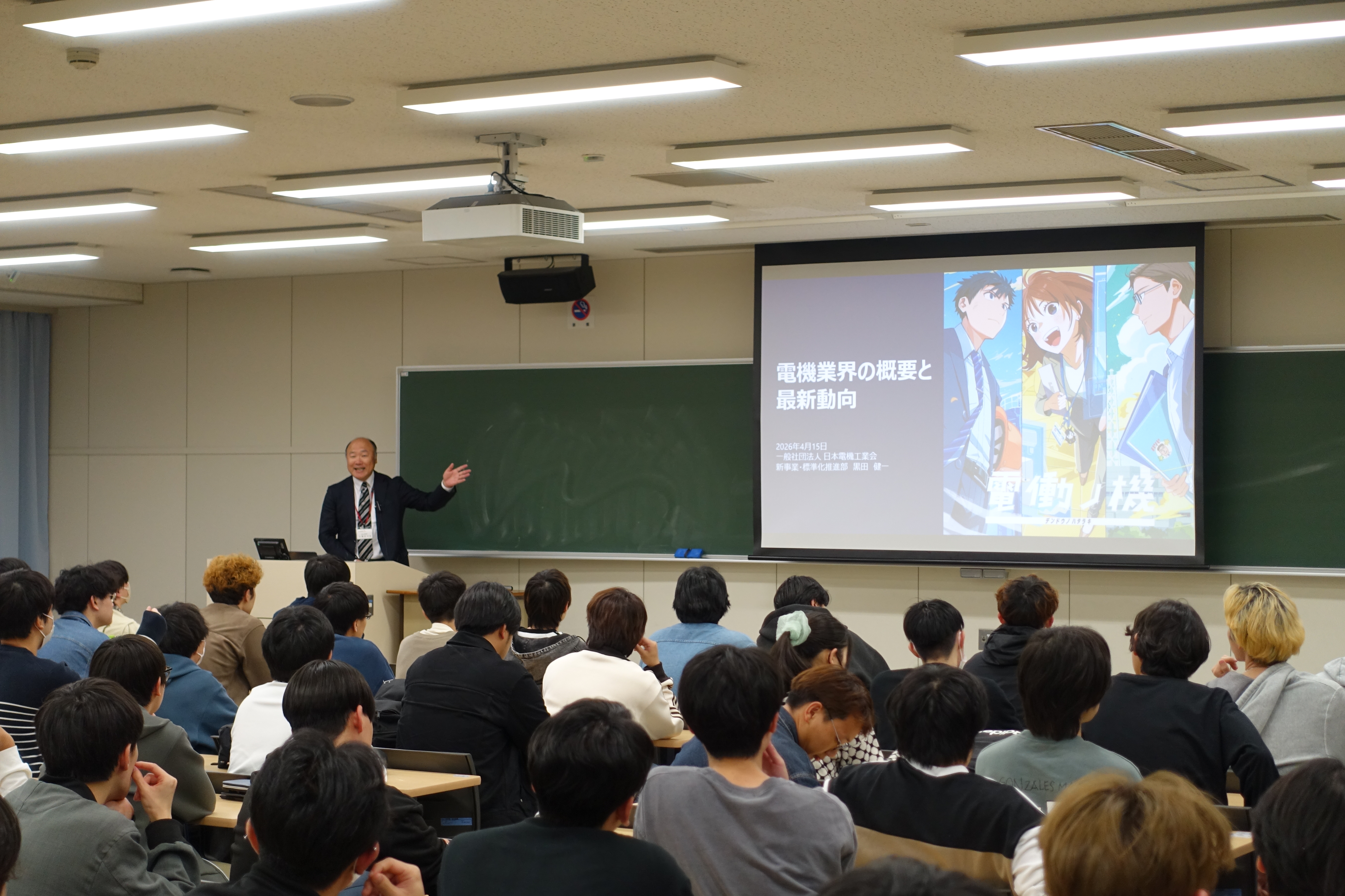 前半は日本電機工業会の新事業・標準化推進部部長の黒田さまに「電機業界の概要と最新動向」と題してご講演いただきました。大きな電力を伴う製品を作る「重電」や身近な製品を作る「家電」など,電機メーカーにも様々な分野があり、各分野での最新動向や将来展望についてご説明いただきました。また、就職活動を控えた3年生に対しての貴重なアドバイスもいただきました。