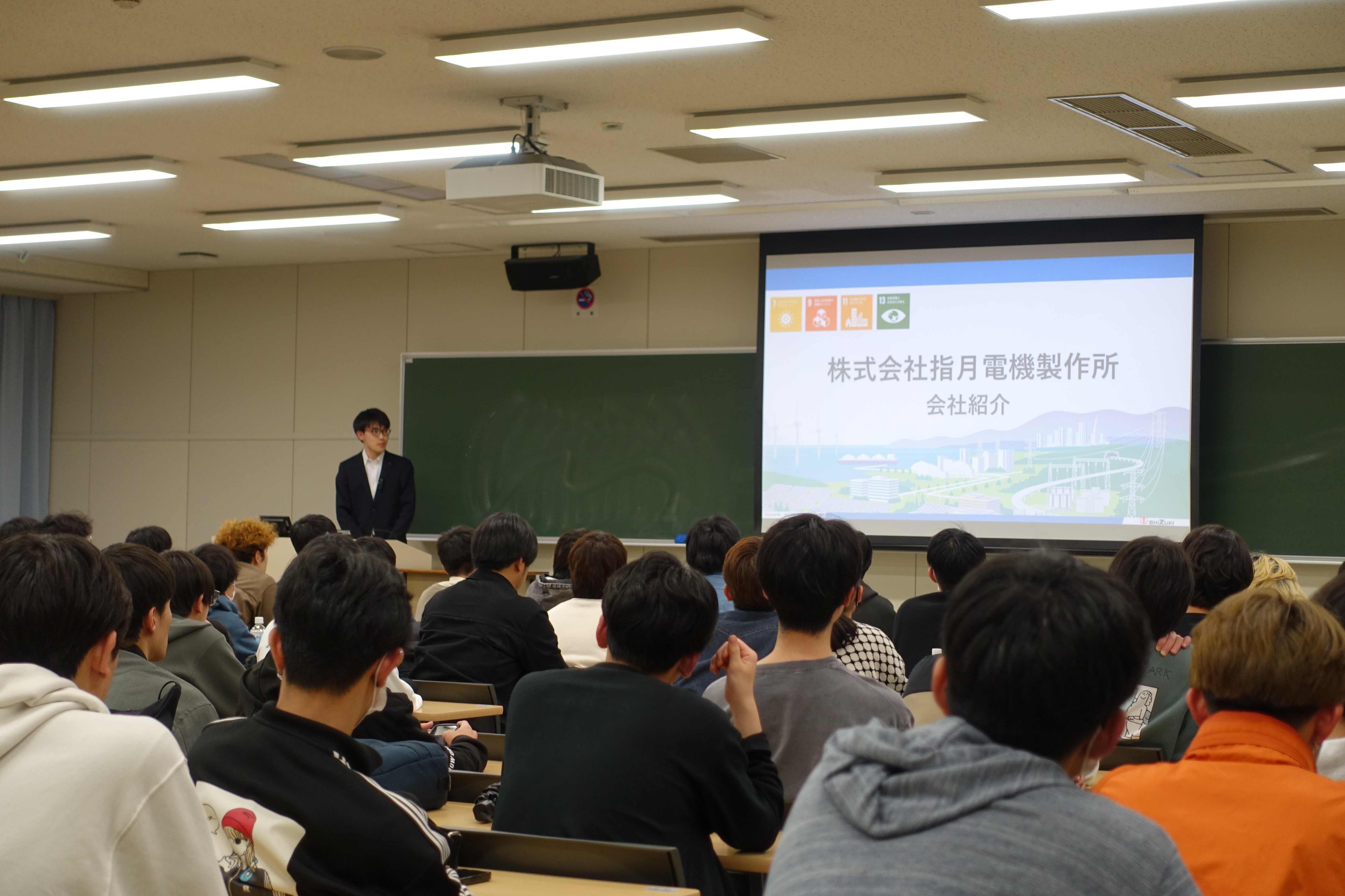 後半はコンデンサと電力システム機器を製造している「指月電機製作所」の電力システム事業部でエンジニアとして働いており、摂南大学の卒業生でもある岡本さまに、事業内容や業務内容についてご紹介いただきました。入社4年目ということで、参加した学生にとっては少し未来の働く姿を想像できたのではないでしょうか。