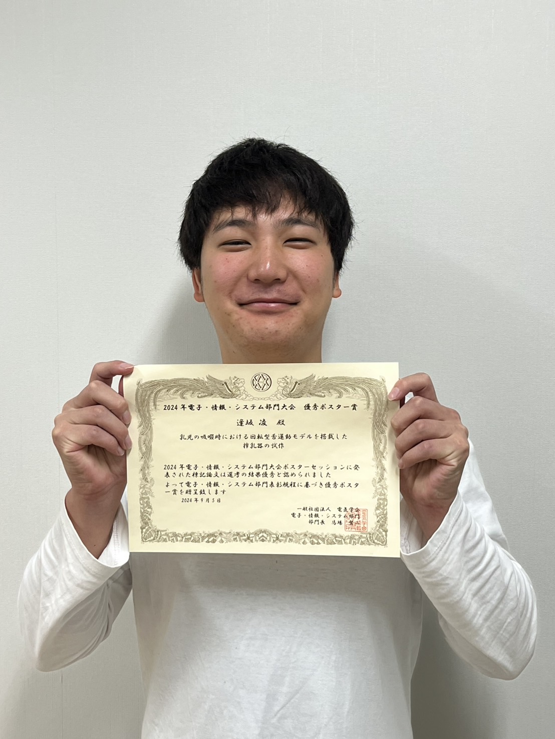 | 2024年9月に開催された2024年電気学会電子・情報・システム部門大会で大学院2年生の逢坂くんが"乳児の吸啜時における回転型舌運動モデルを搭載した搾乳器の試作"をポスター発表し、2024年電子・情報・システム部門大会優秀ポスター賞を受賞しました。 | |||||||||||||||||