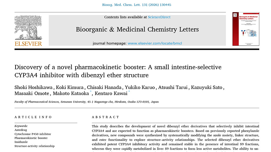 - 2024.04.25PAPER薬剤学研究室の片岡 誠 教授ならびに医薬品化学研究室の河合 健太郎 教授らの論文が、Drug Metabolism and Pharmacokinetics誌に掲載されました。