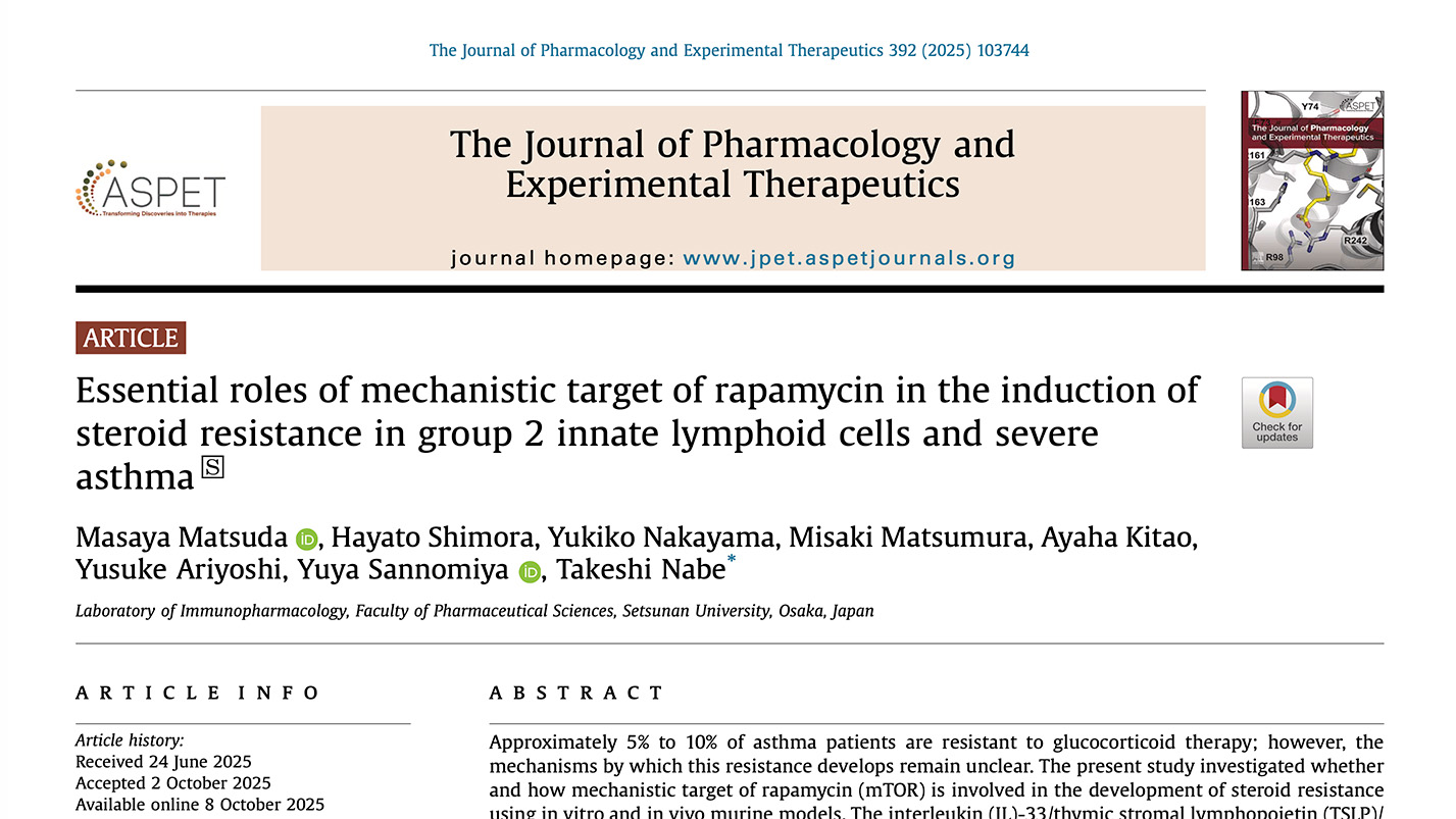 - 2025.11.14PAPER薬効薬理学研究室 松田 将也 助教、霜良 勇人 大学院生、奈邉 健 教授らの原著論文が、The Journal of Pharmacology and Experimental Therapeutics誌に掲載されました。