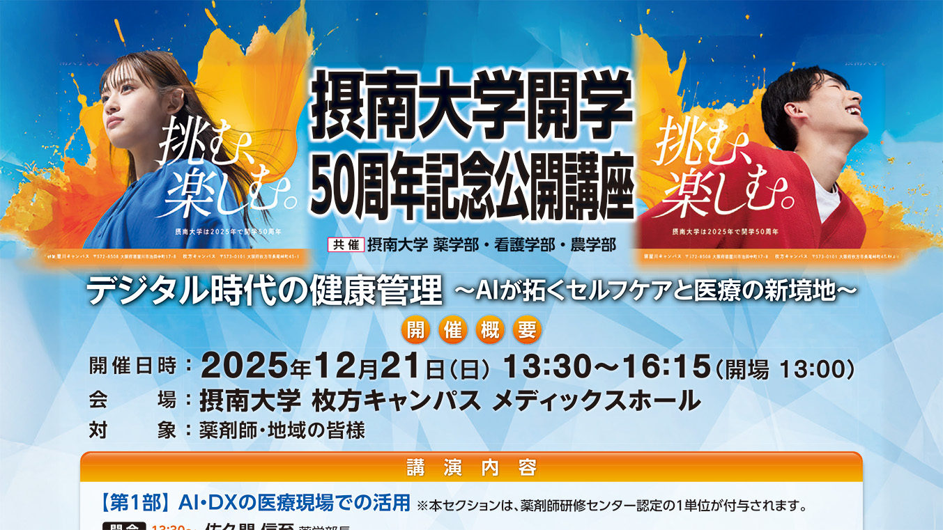 - 2025.10.31EVENT摂南大学は、開学50周年を記念し、薬学部・看護学部・農学部と共催で公開講座を開催します。地域の皆さま、医療関係者、卒業生、学生の皆さまのご参加をお待ちしております。詳しくはコチラをクリックしてください。