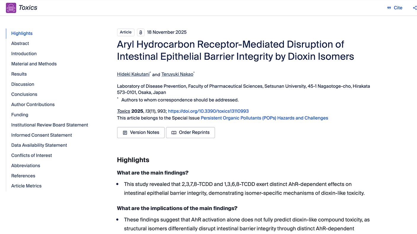 - 2024.05.08PAPER疾病予防学研究室の角谷 秀樹 講師ならびに中尾 晃幸 准教授らの論文が、The Journal of Toxicological Sciences誌に掲載されました。