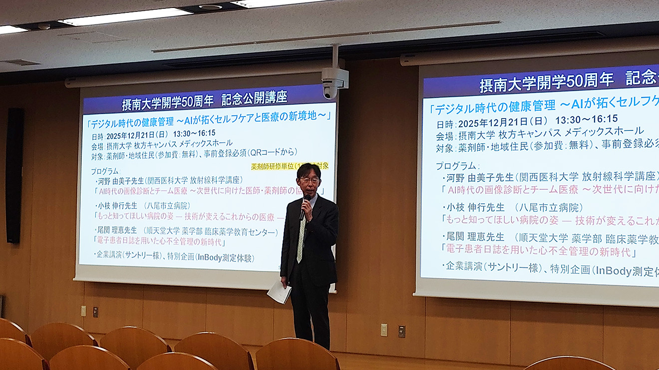 - 2025.12.21EVENT薬学部・看護学部・農学部の共催により、摂南大学開学50周年記念公開講座が、枚方キャンパス メディックスホールにて開催されました。『デジタル時代の健康管理 ~AIが拓くセルフケアと医療の新境地~』をテーマに、地域住民、卒業生、学生、医療関係者の皆さまに向けて、最新の知見を発信する機会となりました。当日は一般参加者の皆さまからも多くの質問・意見が寄せられ、登壇者との間で活発な議論が行われるなど、学びの深まる充実した時間となりました。また、特別企画として実施したInBody測定体験も多くの参加者でにぎわい、ご自身の身体の状態を知るきっかけとして好評をいただきました。