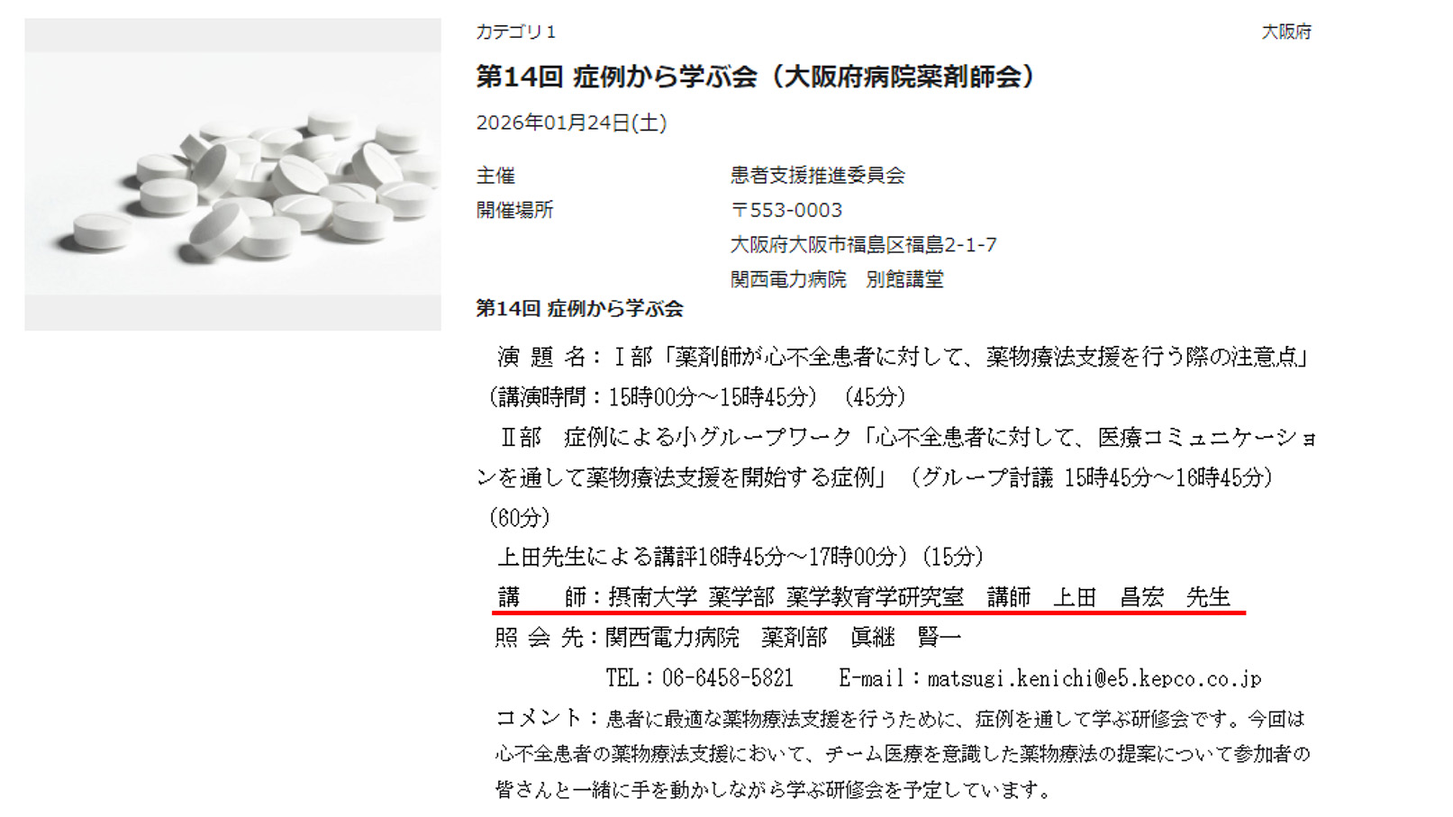 - 2026.01.19EVENT薬学教育学研究室の上田昌宏 講師が、大阪府病院薬剤師会より依頼を受け、2026年1月24日開催の「第14回 症例から学ぶ会」(関西電力病院 別館講堂)にて講演を行います。