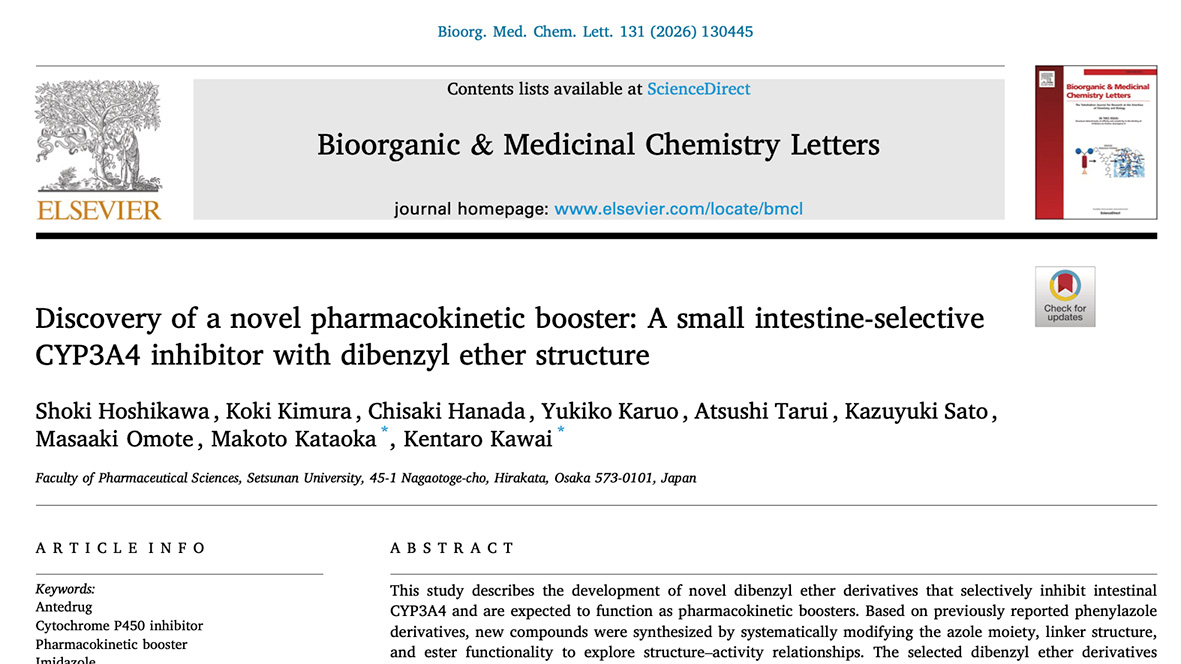 - 2026.01.21PAPER医薬品化学研究室 干川 翔貴 助教、河合 健太郎 教授らの原著論文が、Bioorganic & Medicinal Chemistry Letters誌に掲載されました。
