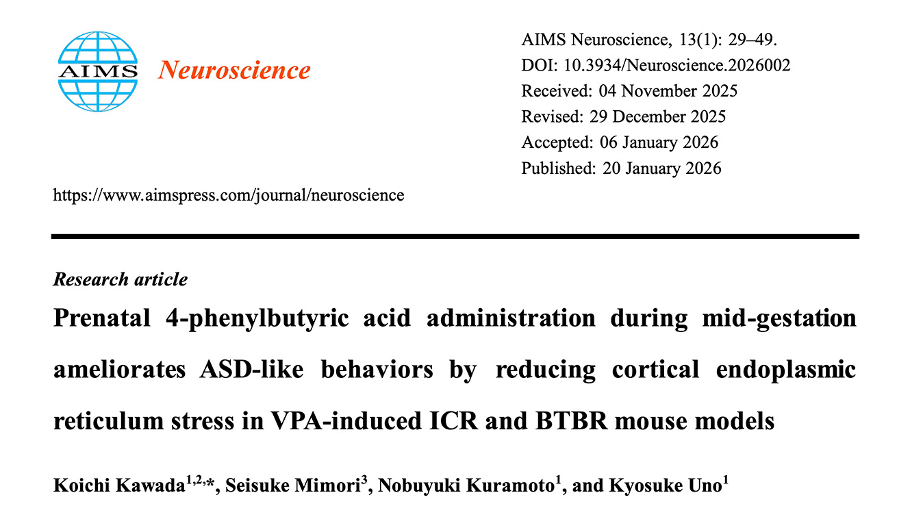 - 2026.01.23PAPER機能形態学研究室 川田 浩一 講師らの原著論文が、AIMS Neuroscience誌に掲載されました。