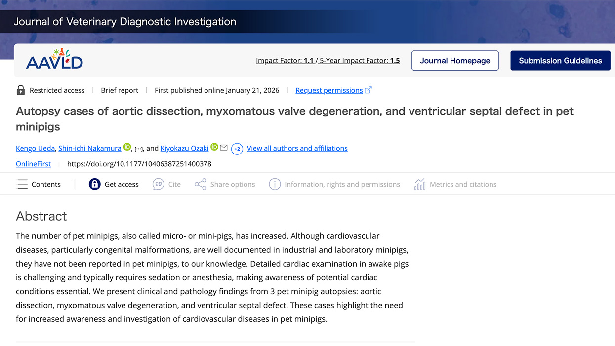 - 2026.01.26PAPER病理学研究室 尾崎 清和 教授らの原著論文が、Journal of Veterinary Diagnostic Investigation誌に掲載されました。