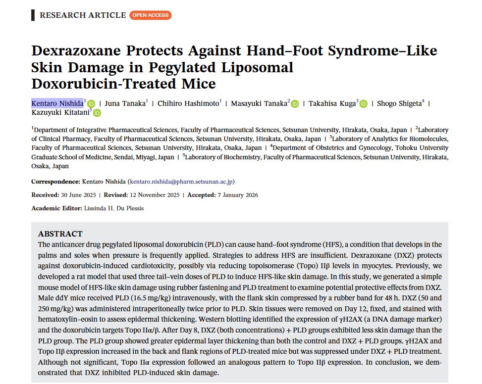 - 2026.02Paper Nishida K, Tanaka J, Hashimoto C, Tanaka M, Kuga T, Shigeta S, Kitatani K (2024) Dexrazoxane Protects Against Hand–Foot Syndrome–Like Skin Damage in Pegylated Liposomal Doxorubicin-Treated Mice. Journal of Toxicology, 2026; 2026:1358796.